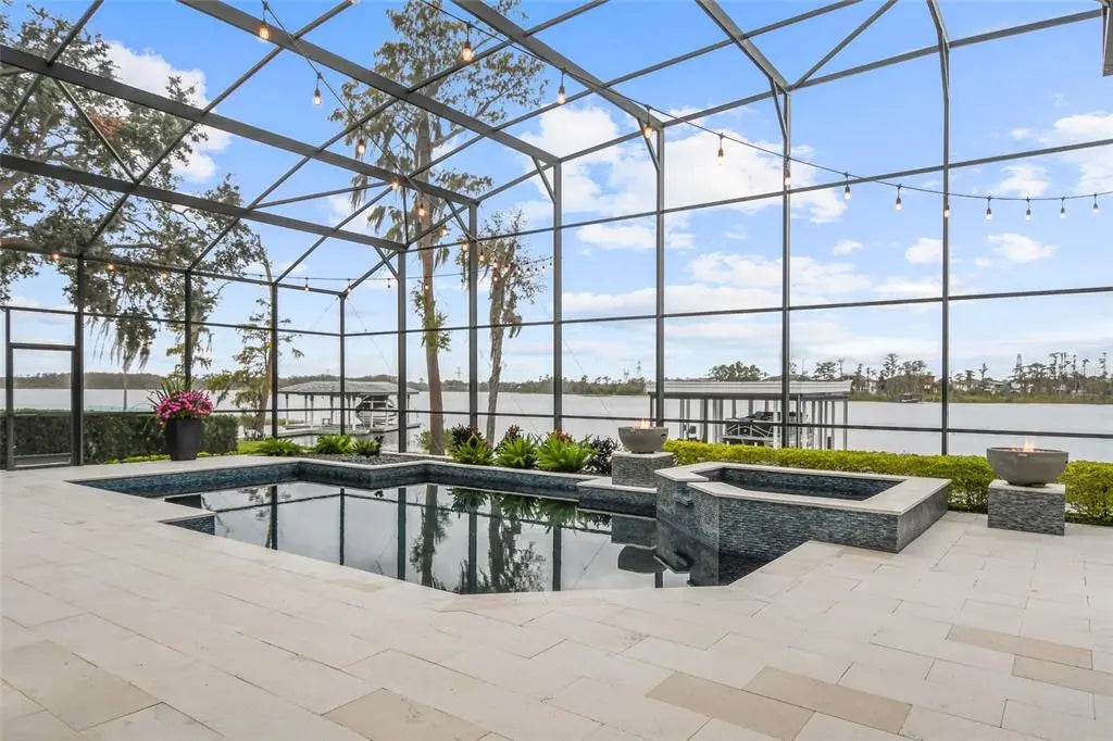 Almost 4,700 ft. 4 bedrooms, 4 bath plus an office, this family estate features all well designed living spaces with high-end finishes. The most impressive feature of the stunning home is outdoor living space with 215 feet of water Front and an unobstructed panoramic views of Lake Tibet. The spectacular views and sunsets from your slice of paradise this immaculate home that has 12 foot ceilings and open floor plan, custom chef's kitchen, custom cabinets upgraded appliances, gas cooktop, double islands plus a breakfast nook and it's open to a spacious family room. Downstairs you'll find three of the four bedrooms. The primary suite is a true retreat with featuring double closets, a walk-in shower and dual sinks. The other 2 bedroom are seperated with a Jack and Jill bathroom. The movie room is right off the family room that includes the over sized movie screen and a ceiling mounted projector. The upstairs is a separate retreat with the fourth bedroom and a full bath includes seperate sitting area or office. The custom landscaping, paver driveway, oversized three car garage, boat deck built in 2024, the boat dock has electric remote screen surrounding the boat, and a New Roof 2025. This home has been completely remodeled within the last three years. Other features include new windows, plantation shutters, wood floors, Control 4 Smart Home, low voltage yard and Bistro lights, all new light fixtures.Located in beautiful gated community.