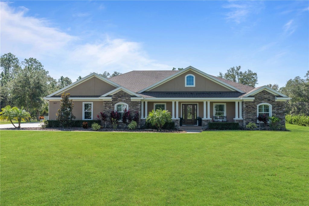 PRICED BELOW APPRAISED VALUE!!!! Don’t miss this opportunity to own a PRIVATE OASIS in PLANTATION OAKS, nestled between Orlando and Tampa. This luxurious custom built RANCH ESTATE spans over 2.5 ACRES in a gated community showcasing 5 bedrooms and 2 full bathrooms with exceptional attention to detail throughout. This spacious open concept includes 14ft tray ceilings upon the entry way as well as upgraded light fixtures/fans, luxury vinyl flooring, and large sliding pocket doors offering beautiful views of the backyard. As you enter the home you're welcomed by an impressive family room with a split executive floor plan. Doors adjacent to the family room open into the office/den with views of the front yard. The gourmet kitchen boasts a large island, quartz countertops, custom high-end cabinetry, stainless steel appliances, subway tile backsplash, pendant lighting and cabinet storage under the island. Dining room features a built-in waiter's station and oversized pocket sliding glass doors that open onto covered lanai/pool creating the perfect indoor/outdoor space for entertaining. The oversized Master Suite provides private lanai access, high tray ceiling and dual walk-in closets that open into a spa-inspired bath. An extended hallway from the primary suite leads to a large laundry room equipped with a freestanding full-size freezer and refrigerator, additional cabinets and counter space. Door entry off the laundry room opens into a bedroom/office with private access into a fully insulated, air conditioned single car garage. Easy to transform into a private in-law suite. Additional bedrooms located across the home boasting a full size guest bath centered between the rooms down a private corridor. Resort style saltwater pool/spa with fountain features overlooking the pristine landscaping and conservation, creates a private oasis you are sure to enjoy. Expanded paver pad located just off the oversized 3-car garage with side entry is perfect for RV or additional parking. If you're looking for quality construction, acreage and luxurious country style living just a short distance from major urban cities then you won't want to miss this opportunity. Convenient access to major county roads and highways. Just mins away from the Plant City Airport - TPA, Lakeland Linder International - LAL and less than 30 mins from Tampa International Airport, Tampa Bay, Davis Island and much much more!!!!!